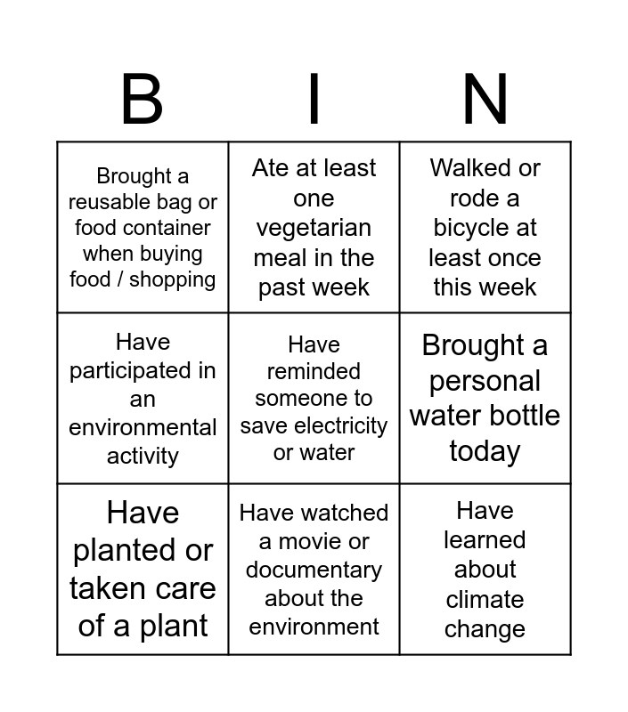 This bingo card has a free space and 8 words: Brought a personal water bottle today, Walked or rode a bicycle at least once this week, Ate at least one vegetarian meal in the past week, Have planted or taken care of a plant, Brought a reusable bag or food container when buying food / shopping, Have learned about climate change, Have participated in an environmental activity and Have watched a movie or documentary about the environment.