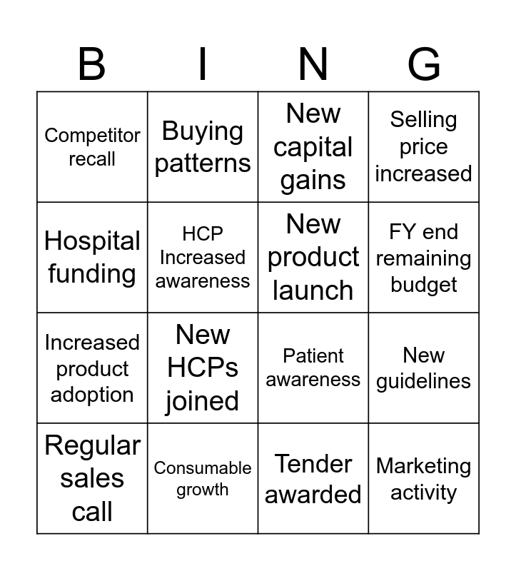 This bingo card has 17 words: Regular sales call, Consumable growth, New capital gains, Selling price increased, Increased product adoption, HCP Increased awareness, Patient awareness, FY end remaining budget, Hospital funding, New HCPs joined, Tender awarded, New guidelines, Competitor recall, Buying patterns, New product launch, Marketing activity and Regular sales call.