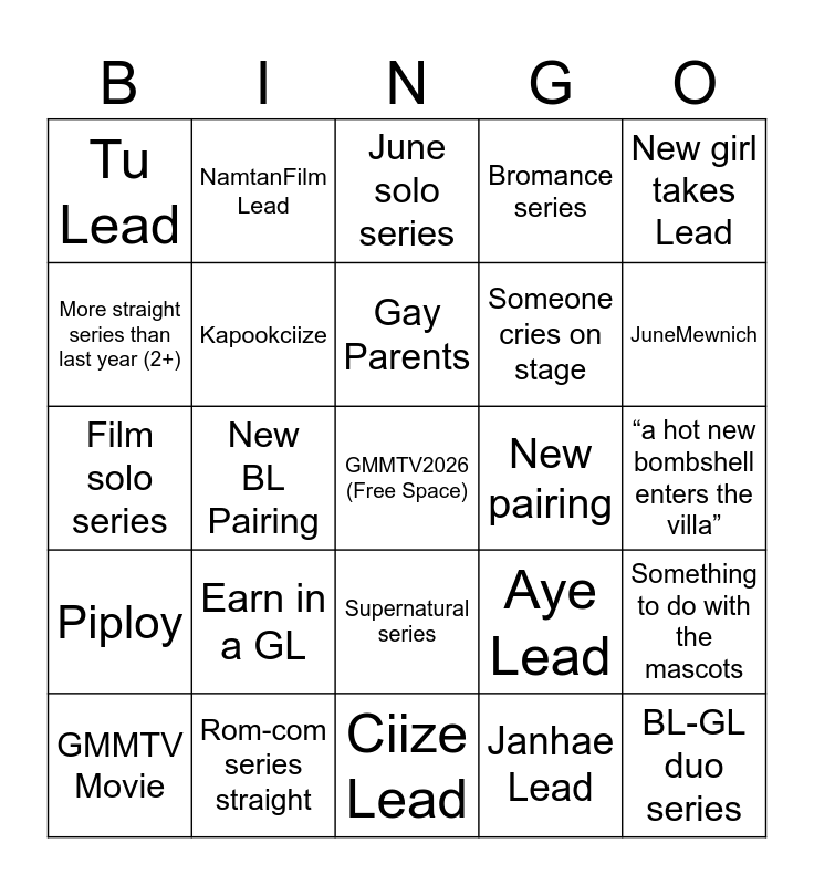 This bingo card has a free space and 34 words: BBFanFest pt.2, Janhae Lead, Namtan solo series, Someone outside GMMTV gets lead role, Piploy, Kapookciize, New girl takes Lead, GMMTV Movie, NamtanFilm Lead, Unexpected pairing, Gay Parents, June solo series, Drama heavy series, 4+ GLs, New pairing, JuneMewnich, Rom-com series straight, Film solo series, Earn in a GL, Aye Lead, Supernatural series, Emibonnie, Tu Lead, “a hot new bombshell enters the villa”, Ciize Lead, BL-GL duo series, Bromance series, Official Trailer drops, Someone cries on stage, More straight series than last year (2+), New Kids series, New BL Pairing, Something to do with the mascots and Women-centric series.