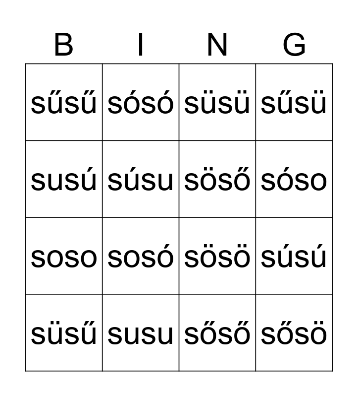 This bingo card has 16 words: susu, súsú, süsü, sűsű, soso, sósó, sösö, sőső, susú, súsu, süsű, sűsü, sosó, sóso, söső and sősö.