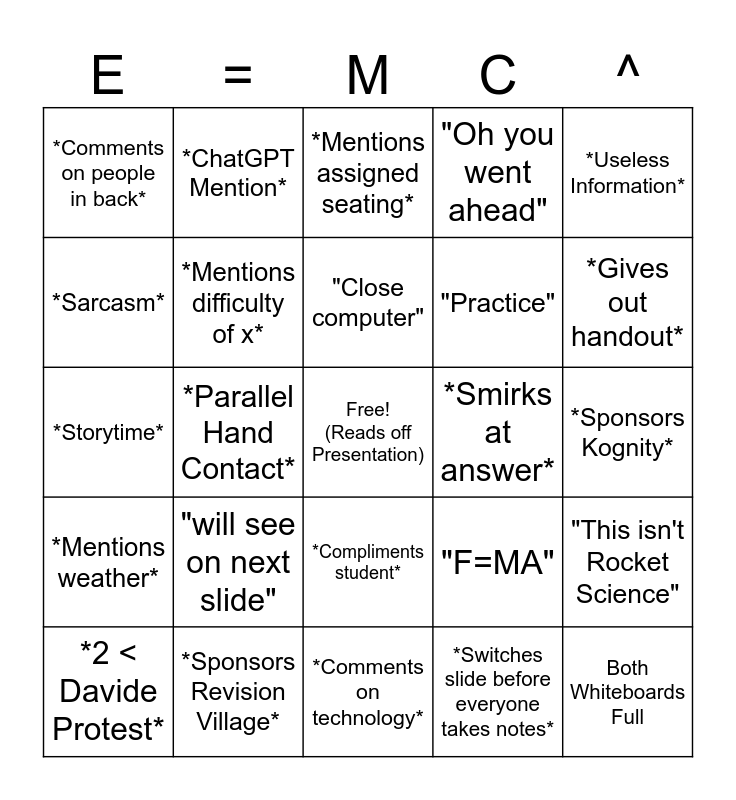 This bingo card has a free space and 29 words: *2 < Davide Protest*, *Perpendicular Hand Contact*, *Parallel Hand Contact*, *Vaguely Answers Question*, *Comments on people in back*, *Mentions assigned seating*, *Mentions difficulty of x*, "will see on next slide", *Smirks at answer*, *Sponsors Revision Village*, *Sponsors Kognity*, Both Whiteboards Full, *Comments on technology*, *Switches slide before everyone takes notes*, *Gives out handout*, *Explains Handout question on board*, *Compliments student*, *Mentions weather*, *Useless Information*, *Storytime*, "F=MA", *Silence*, "Practice", *Sarcasm*, "Oh you went ahead", *ChatGPT Mention*, "This isn't Rocket Science", "Close computer" and *Gaslights*.