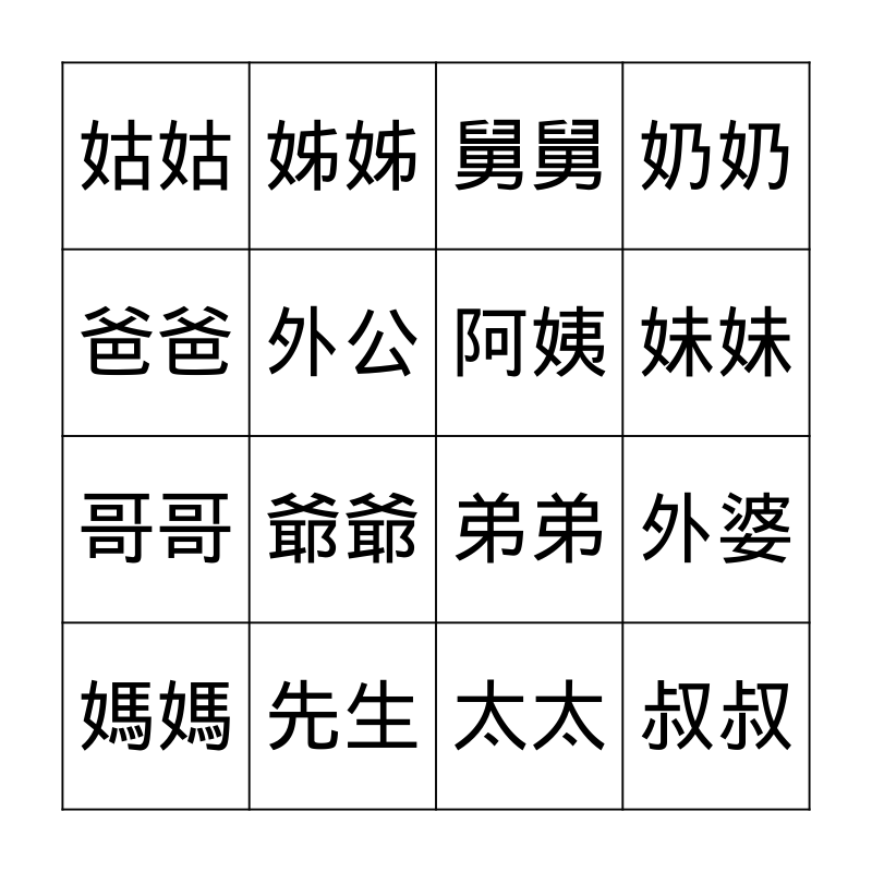 中文 Bingo 家人 | 我的家人:kinership | Family Vocab Bingo Characters | 當代中文 B1 L2 生詞 | 家庭成員