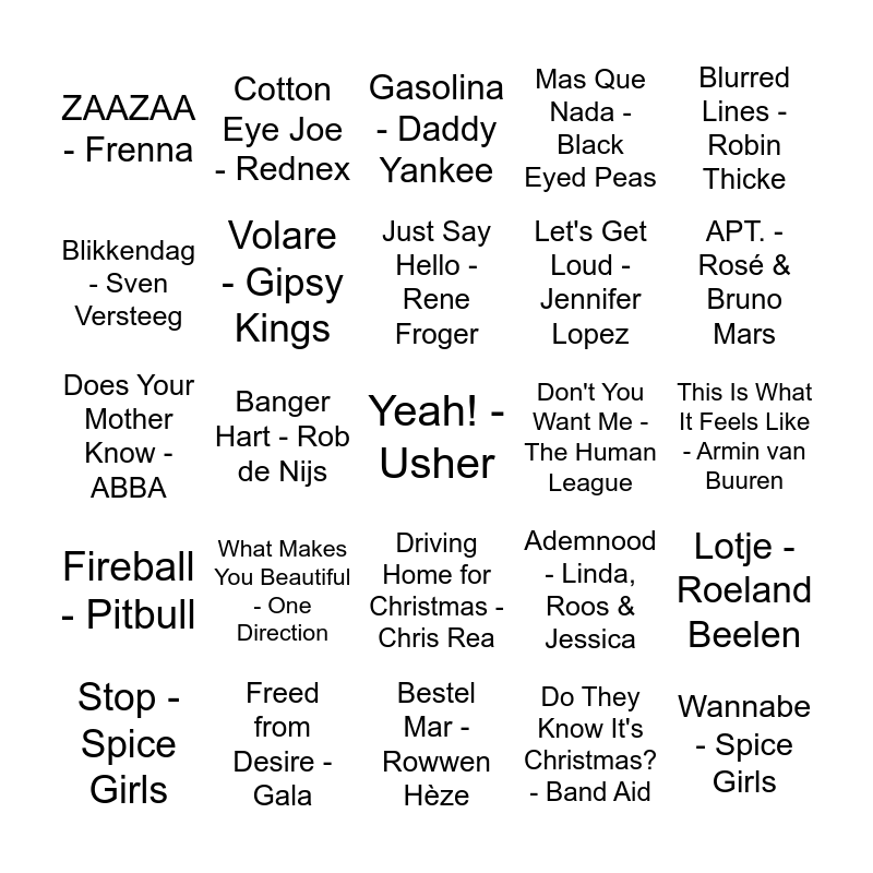 This bingo card has 36 words: Why Tell Me Why - Anita Meyer, Everybody - Backstreet Boys, Heb Je Even Voor Mij - Frans Bauer, Volare - Gipsy Kings, Ademnood - Linda, Roos & Jessica, Fireball - Pitbull, Just Say Hello - Rene Froger, Zoet, Zout, Zuur - Robert van Hemert, Blurred Lines - Robin Thicke, Hips Don't Lie - Shakira, Banger Hart - Rob de Nijs, Mas Que Nada - Black Eyed Peas, I Wanna Dance with Somebody - Whitney Houston, Don't You Want Me - The Human League, APT. - Rosé & Bruno Mars, ZAAZAA - Frenna, Wannabe - Spice Girls, What Makes You Beautiful - One Direction, Yeah! - Usher, Gasolina - Daddy Yankee, This Is What It Feels Like - Armin van Buuren, Lotje - Roeland Beelen, Freed from Desire - Gala, Stop - Spice Girls, Bestel Mar - Rowwen Hèze, Cotton Eye Joe - Rednex, Does Your Mother Know - ABBA, Copacabana - Barry Manilow, Let's Get Loud - Jennifer Lopez, Blikkendag - Sven Versteeg, Relight My Fire - Dan Hartman, Mexico - Zangeres Zonder Naam, Do They Know It's Christmas? - Band Aid, Driving Home for Christmas - Chris Rea, Merry Xmas Everybody - Slade and Santa Claus Is Coming To Town - Jackson 5.