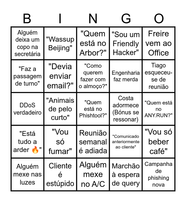 This bingo card has 37 words: Free!, Marchão fala de THM, Ticket não cai no SNOW, "Devia enviar email?", "Vou só beber café", "Vou só fumar", "Como querem fazer com o almoço?", "Quem está no office?", Freire vem ao Office, Joana foi para o SIRESP, "Animais de pelo curto", "Sou um Friendly Hacker", "Quem está no Phishtool?", "Quem está no ANY.RUN?", "Faz a passagem de turno", "Está tudo a arder 🔥", "Quantos tickets temos?", "Quem está no Arbor?", Reunião semanal é adiada, Costa adormece (Bónus se ressonar), Alguém deixa um copo na secretária, Tiago esqueceu-se de reunião, Alguém mexe nas luzes, Alguém mexe no A/C, Bruno avisa de ataque (Bónus se projeto), Marchão à espera de query, "Wassup Beijing", Engenharia manda ticket (Bónus se falso positivo), Report do report de phishing, Publicidade = Phishing, Red faz pentest, Cliente é estúpido, DDoS verdadeiro, Campanha de phishing nova, "Comunicado anteriormente ao cliente", Engenharia faz merda and "Mitra reviews MITRE".