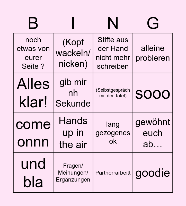 This bingo card has 24 words: Mensch hau rein!, Lies es dir nochmal GENAU durch!, sooo, jajajaja, Alles klar!, noch etwas von eurer Seite ?, gib mir nh Sekunde, (Kopf wackeln/ nicken), Fragen/ Meinungen/ Ergänzungen, hier kurz Stopp, come onnn, lang gezogenes ok, einige schreiben noch, ja komm ey, (Selbstgespräch mit der Tafel), fertig werden mit abschreiben, Partnerrarbeitt, Stifte aus der Hand nicht mehr schreiben, Hands up in the air, gewöhnt euch ab…, und bla, goodie, alleine probieren and schnell zusammenfassen.