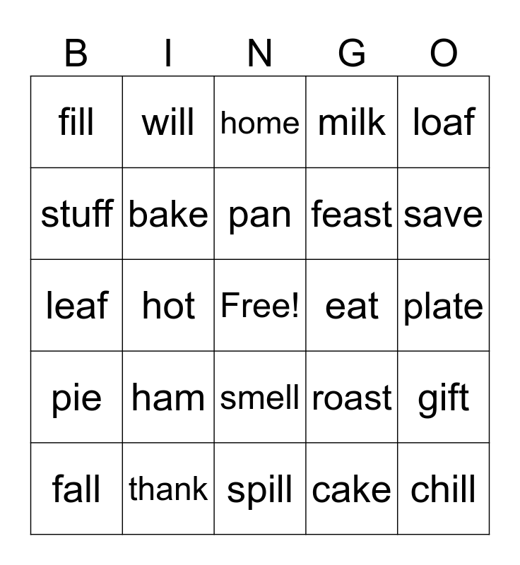 This bingo card has a free space and 24 words: ham, thank, pan, fall, loaf, fill, stuff, will, eat, smell, feast, leaf, roast, gift, bake, cake, plate, home, save, hot, chill, pie, milk and spill.