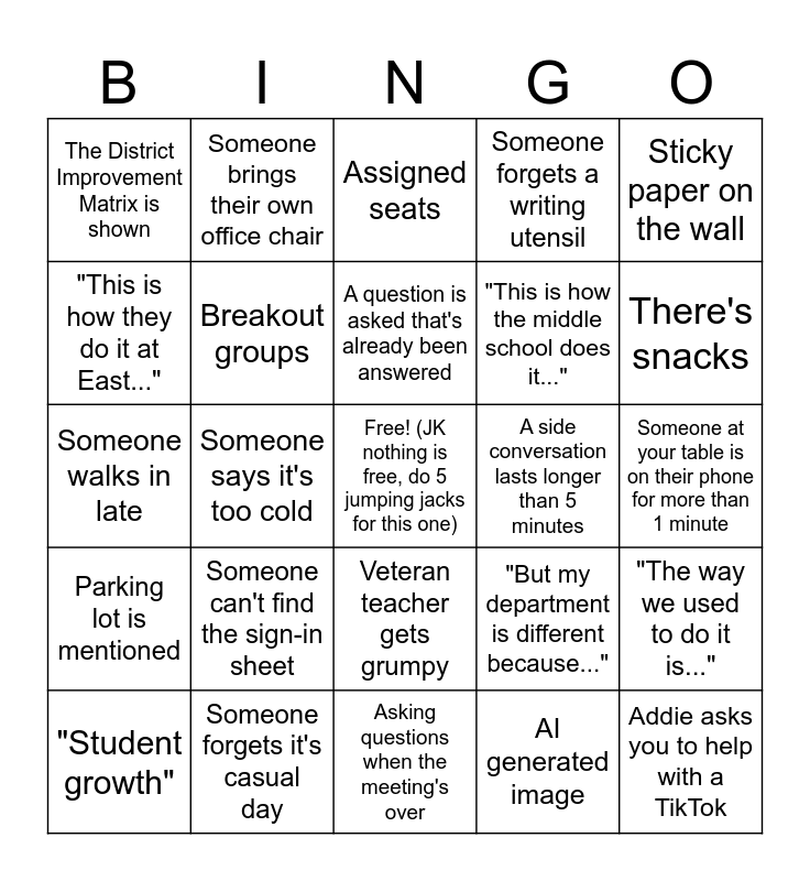 This bingo card has a free space and 32 words: AI generated image, Someone says it's too hot, Someone says it's too cold, "Rumble", Parking lot is mentioned, Breakout groups, Sticky paper on the wall, "The way we used to do it is...", Someone brings their own office chair, "Rigor", A question is asked that's already been answered, Assigned seats, Brett Addis does the math, Padlet or Kahoot, A side conversation lasts longer than 5 minutes, Someone stands for more than 2 minutes, "Student growth", Someone walks in late, Veteran teacher gets grumpy, Someone can't find the sign-in sheet, "But my department is different because...", Someone at your table takes more than 2 pieces of candy, Someone at your table is on their phone for more than 1 minute, Someone forgets it's casual day, Addie asks you to help with a TikTok, Someone forgets a writing utensil, "This is how the middle school does it...", "This is how they do it at East...", The District Improvement Matrix is shown, Asking questions when the meeting's over, A joke that's actually funny and There's snacks.
