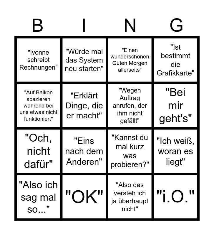 This bingo card has 16 words: "OK", "Ich weiß, woran es liegt", "Einen wunderschönen Guten Morgen allerseits", "Ivonne schreibt Rechnungen", "Och, nicht dafür", "Würde mal das System neu starten", "Kannst du mal kurz was probieren?", "Also das versteh ich ja überhaupt nicht", "Auf Balkon spazieren während bei uns etwas nicht funktioniert", "Erklärt Dinge, die er macht", "Also ich sag mal so...", "Ist bestimmt die Grafikkarte", "Eins nach dem Anderen", "Bei mir geht's", "Wegen Auftrag anrufen, der ihm nicht gefällt" and "i.O.".