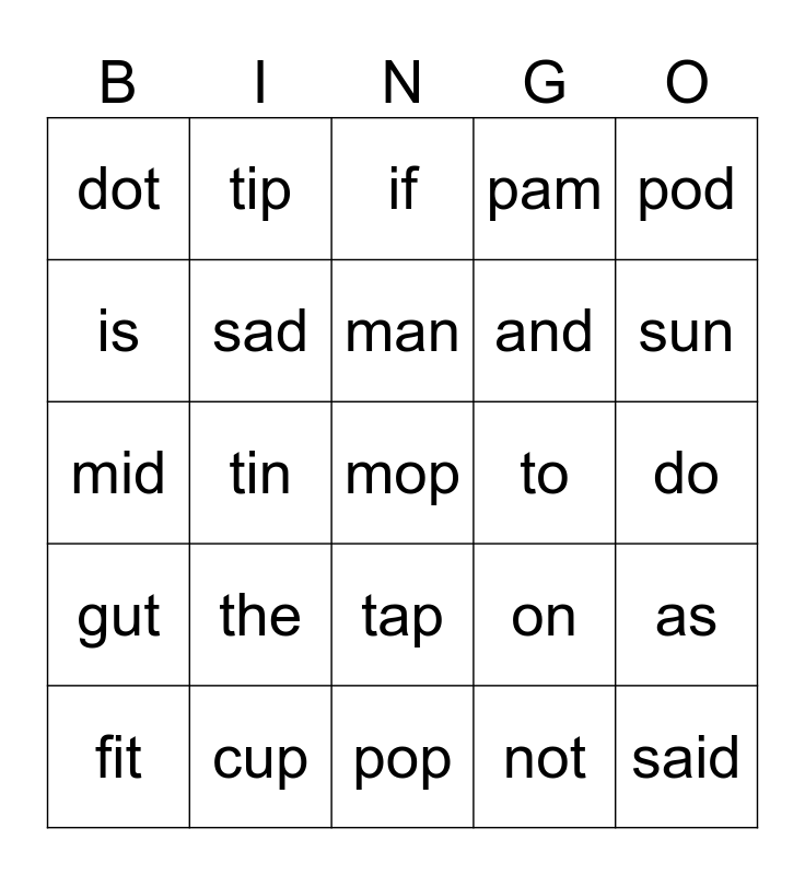 This bingo card has a free space and 24 words: the, cup, man, fit, pod, dot, is, tip, to, tap, and, mid, on, as, sad, not, do, if, sun, tin, said, gut, pam and pop.