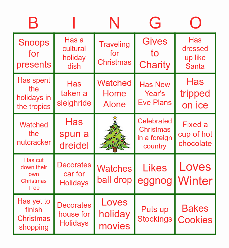 This bingo card has a free space and 55 words: Wears a ugly holiday sweater, Has yet to finish Christmas shopping, Christmas is favorite Holiday, Snoops for presents, Loves holiday movies, Celebrating Christmas in a warm place, Has taken a sleighride, Puts up Stockings, Has New Year's Eve Plans, Built a gingerbread house, Gives to Charity, Will celebrate more than one Christmas, Skis or snowboards, Sick of Christmas Carols, Making a New Year's resolution, Likes to sing carols, Has dressed up like Santa, Has spun a dreidel, Put pets on Christmas photos, Bakes Cookies, Celebrated Christmas in a foreign country, Counts "Die Hard" as an Holiday movie, Likes eggnog, Traveling for Christmas, Likes Rudolph the Red-Nose Reindeer, Watched Home Alone, Puts up Stockings, Has built a snowman, Fixed a cup of hot chocolate, Loves Winter, Parties on New Year's Eve, Has Holiday Parties, Has spun a dreidel, Kissed someone under mistletoe, Has spent the holidays in the tropics, Watched the nutcracker, Has been to a nutcracker show, Has cut down their own Christmas Tree, Has family over for holidays, Has family tradition for holidays, Has a cultural holiday dish, Opens gifts before 7 am, Has holiday sweater for pet(s), Wears a ugly holiday sweater, Decorates car for Holidays, Decorates house for Holidays, Sends out Holiday cards, Takes holiday photos with Family, Bought gift(s) for pet, Has tripped on ice, Goes to the movies on Christmas, Has gotten stuck in snow, Enjoys fruitcake, Watches ball drop and Has experienced a white Christmas.