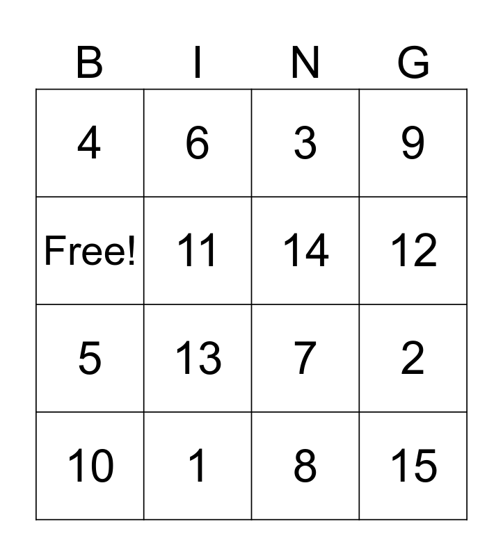 This bingo card has 16 words: 1, 2, 3, 4, 5, 6, 7, 8, Free!, 11, 10, 9, 13, 12, 14 and 15.