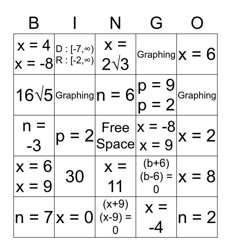 This bingo card has a free space and 24 words: 30, x = 0, n = 6, n = 7, x = 6, x = 4 x = -8, 16√5, D : [-7,∞) R : [-2,∞), x = -8 x = 9, x = 11, p = 9 p = 2, n = -3, (b+6)(b-6) = 0, x = 8, Graphing, x = -4, x = 2, x = 2√3, Graphing, p = 2, n = 2, x = 6 x = 9, Graphing and (x+9)(x-9) = 0.