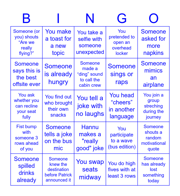 This bingo card has 25 words: Someone tells a joke on the bus mic, You swap seats midway, Someone made a “ding” sound to call the cabin crew, Someone spilled drinks already, Someone asked for more napkins, Someone (or you) shouts “Are we really flying?”, Someone says this is the best offsite ever, You make a toast for a new topic, You head “cheers” in another language, Hannu makes a "really good" joke, Someone sings or raps, You ask whether you can recline your seat fully, You participate to a wave (bus edition), Someone shouts a random motivational quote, Someone is already hungry, Someone has already lost something today, You join a group streching during the journey, You take a selfie with someone unexpected, Someone mimics an airplane, You find out who brought their own snacks, You tell a joke with no laughs, Someone knew the destination before Patrick announced it, Fist bump with someone 3 rows ahead of you, You pretended to open an overhead locker and You do high fives with at least 3 rows.