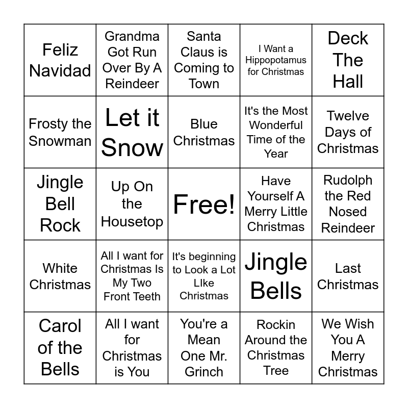 This bingo card has a free space and 24 words: All I want for Christmas Is My Two Front Teeth, All I want for Christmas is You, Blue Christmas, Carol of the Bells, Deck The Hall, Feliz Navidad, Frosty the Snowman, Grandma Got Run Over By A Reindeer, Have Yourself A Merry Little Christmas, It's beginning to Look a Lot LIke Christmas, It's the Most Wonderful Time of the Year, Jingle Bell Rock, Jingle Bells, Last Christmas, Let it Snow, Rockin Around the Christmas Tree, Rudolph the Red Nosed Reindeer, Santa Claus is Coming to Town, Twelve Days of Christmas, Up On the Housetop, We Wish You A Merry Christmas, White Christmas, I Want a Hippopotamus for Christmas and You're a Mean One Mr. Grinch.