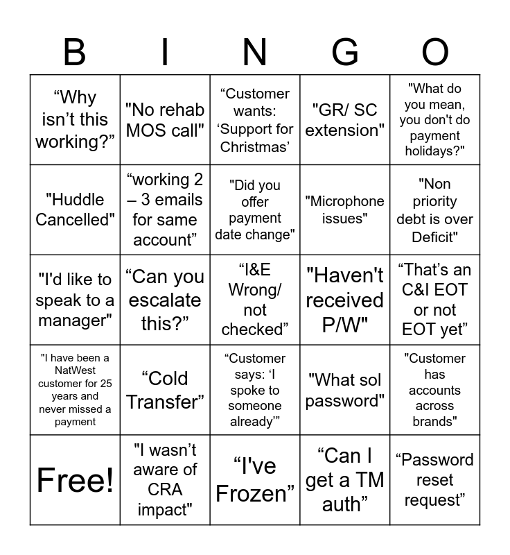 This bingo card has 29 words: Free!, “System is running slow”, “Can you escalate this?”, “Password reset request”, “Why isn’t this working?”, “Customer wants: ‘Support for Christmas’, “working 2 – 3 emails for same account”, “Cold Transfer”, "Haven't received P/W", "I wasn’t aware of CRA impact", “That’s an C&I EOT or not EOT yet”, “I&E Wrong/ not checked”, “I've Frozen”, “Can I get a TM auth”, "Non priority debt is over Deficit", “Team chat: ‘Anyone free for Referral?”, “Customer says: ‘I spoke to someone already’”, "I have been a NatWest customer for 25 years and never missed a payment, "What do you mean, you don't do payment holidays?", "I'd like to speak to a manager", "What sol password", "Raised or inflate a bubble", "Microphone issues", "Huddle Cancelled", "GR/ SC extension", "No rehab MOS call", "Customer has accounts across brands", "Did you offer payment date change" and "Can I have some figures for Sol Please".