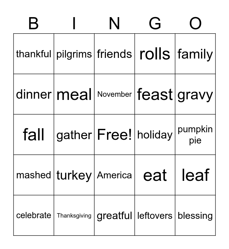 This bingo card has a free space and 24 words: turkey, Thanksgiving, November, celebrate, family, thankful, dinner, pilgrims, holiday, America, feast, fall, eat, leaf, meal, leftovers, pumpkin pie, friends, gravy, gather, blessing, mashed, rolls and greatful.