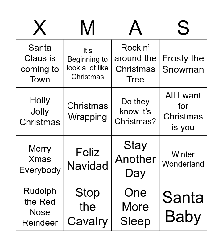 This bingo card has 32 words: Driving Home for Christmas, Wonderful Christmastime, Winter Wonderland, Jingle Bell Rock, Santa Baby, Do they know it’s Christmas?, Holly Jolly Christmas, Let it Snow, Let it Snow, Let it Snow, It’s Beginning to look a lot like Christmas, White Christmas, All I want for Christmas is you, Rockin’ around the Christmas Tree, I Saw Mommy Kissing Santa Claus, Last Christmas, Stop the Cavalry, Mistletoe & Wine, Baby, it’s Cold Outside, Stay Another Day, Mistletoe, Underneath the Tree, Fairytale of New York, Santa Tell Me, One More Sleep, A Winter’s Tale, Rudolph the Red Nose Reindeer, Frosty the Snowman, Merry Xmas Everybody, Christmas Wrapping, Santa Claus is coming to Town, Deck the Halls, Here Comes Santa Claus and Feliz Navidad.