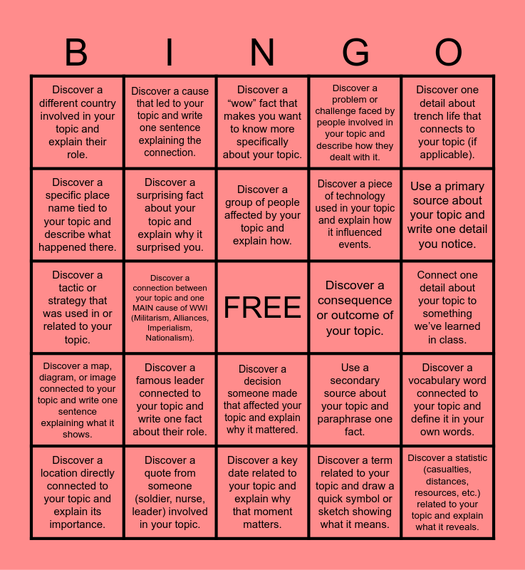 This bingo card has a free space and 24 words: Discover a famous leader connected to your topic and write one fact about their role., Discover a quote from someone (soldier, nurse, leader) involved in your topic., Discover a group of people affected by your topic and explain how., Discover a location directly connected to your topic and explain its importance., Discover one detail about trench life that connects to your topic (if applicable)., Discover a different country involved in your topic and explain their role., Discover a specific place name tied to your topic and describe what happened there., Discover a cause that led to your topic and write one sentence explaining the connection., Discover a consequence or outcome of your topic., Discover a decision someone made that affected your topic and explain why it mattered., Discover a piece of technology used in your topic and explain how it influenced events., Discover a tactic or strategy that was used in or related to your topic., Use a secondary source about your topic and paraphrase one fact., Discover a vocabulary word connected to your topic and define it in your own words., Discover a surprising fact about your topic and explain why it surprised you., Discover a term related to your topic and draw a quick symbol or sketch showing what it means., Connect one detail about your topic to something we’ve learned in class., Discover a “wow” fact that makes you want to know more specifically about your topic., Use a primary source about your topic and write one detail you notice., Discover a connection between your topic and one MAIN cause of WWI (Militarism, Alliances, Imperialism, Nationalism)., Discover a statistic (casualties, distances, resources, etc.) related to your topic and explain what it reveals., Discover a map, diagram, or image connected to your topic and write one sentence explaining what it shows., Discover a problem or challenge faced by people involved in your topic and describe how they dealt with it. and Discover a key date related to your topic and explain why that moment matters..