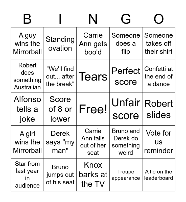 This bingo card has a free space and 24 words: Derek says "my man", Bruno jumps out of his seat, Tears, Star from last year in audience, Someone takes off their shirt, A guy wins the Mirrorball, Robert does something Australian, Standing ovation, Unfair score, Carrie Ann falls out of her seat, Perfect score, Alfonso tells a joke, Bruno and Derek do something weird, Vote for us reminder, "We'll find out... after the break", Troupe appearance, Robert slides, Carrie Ann gets boo'd, Confetti at the end of a dance, Score of 8 or lower, A tie on the leaderboard, A girl wins the Mirrorball, Someone does a flip and Knox barks at the TV.