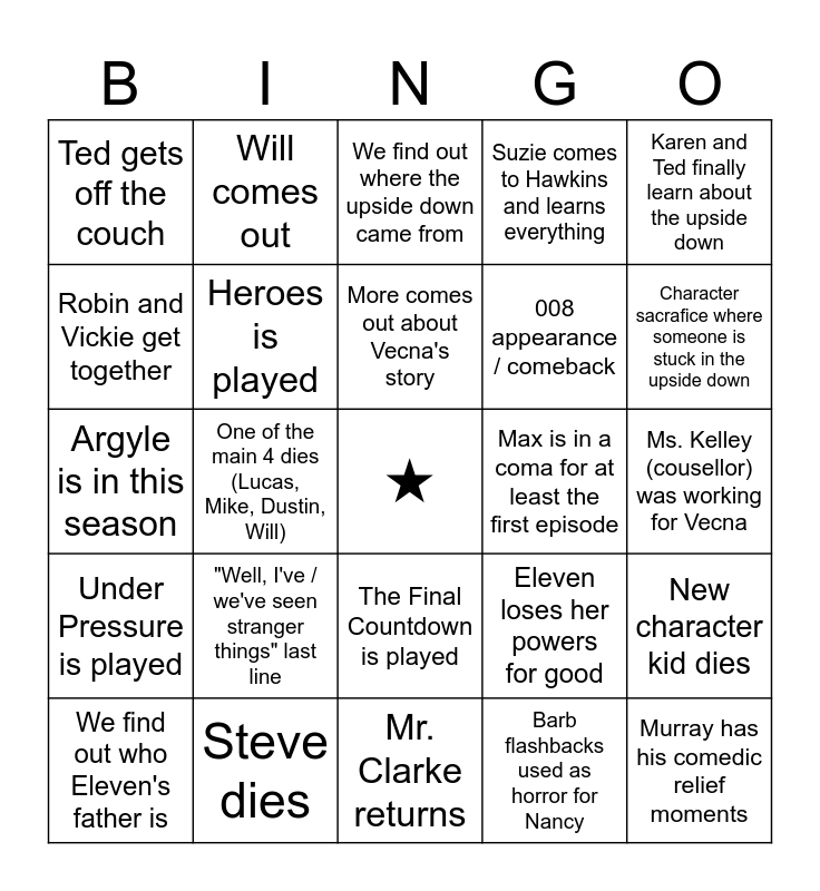 This bingo card has a free space and 24 words: "Well, I've / we've seen stranger things" last line, Steve dies, More comes out about Vecna's story, We find out who Eleven's father is, Karen and Ted finally learn about the upside down, Ted gets off the couch, Robin and Vickie get together, Will comes out, Max is in a coma for at least the first episode, The Final Countdown is played, 008 appearance / comeback, Argyle is in this season, Eleven loses her powers for good, New character kid dies, Heroes is played, Barb flashbacks used as horror for Nancy, Ms. Kelley (cousellor) was working for Vecna, We find out where the upside down came from, Character sacrafice where someone is stuck in the upside down, One of the main 4 dies (Lucas, Mike, Dustin, Will), Murray has his comedic relief moments, Under Pressure is played, Suzie comes to Hawkins and learns everything and Mr. Clarke returns.