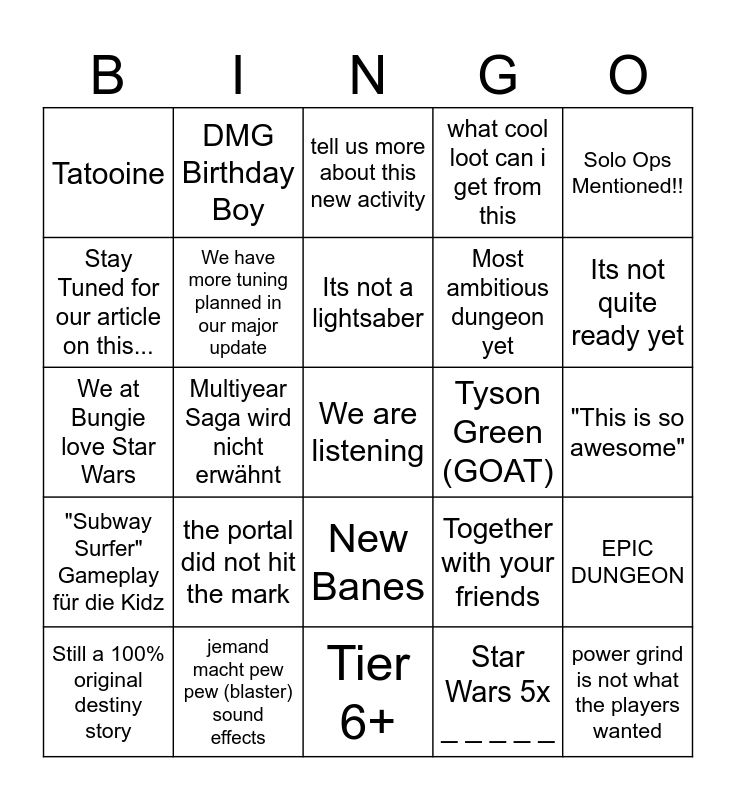 This bingo card has a free space and 24 words: the portal did not hit the mark, jemand macht pew pew (blaster) sound effects, Its not a lightsaber, Still a 100% original destiny story, Solo Ops Mentioned!!, Tatooine, Stay Tuned for our article on this..., DMG Birthday Boy, Tyson Green (GOAT), New Banes, Most ambitious dungeon yet, We at Bungie love Star Wars, Together with your friends, EPIC DUNGEON, We have more tuning planned in our major update, Star Wars 5x _ _ _ _ _, "This is so awesome", tell us more about this new activity, Its not quite ready yet, Multiyear Saga wird nicht erwähnt, power grind is not what the players wanted, "Subway Surfer" Gameplay für die Kidz, what cool loot can i get from this and Tier 6+.