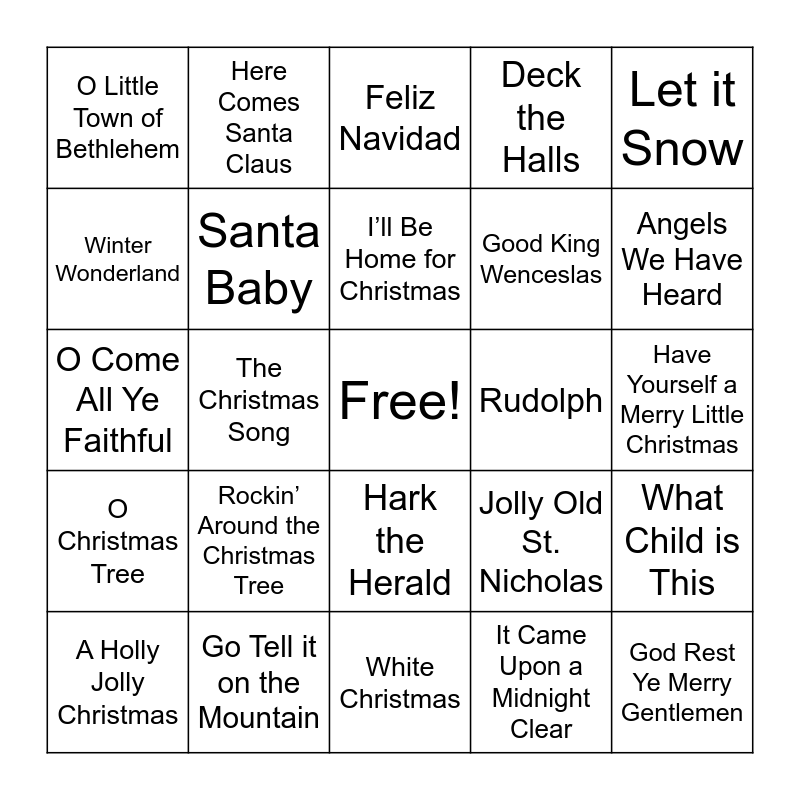 This bingo card has a free space and 40 words: O Holy Night, O Come All Ye Faithful, Silent Night, Santa Baby, Go Tell it on the Mountain, Hark the Herald, I’ll Be Home for Christmas, Jingle Bells, Let it Snow, O Christmas Tree, The Christmas Song, Deck the Halls, God Rest Ye Merry Gentlemen, Have Yourself a Merry Little Christmas, Rudolph, Rockin’ Around the Christmas Tree, We Three Kings, O Little Town of Bethlehem, Santa Claus is Coming, Feliz Navidad, What Child is This, It Came Upon a Midnight Clear, Good King Wenceslas, Winter Wonderland, Auld Lang Syne, The Holly and the Ivy, Frosty the Snowman, The First Noel, Joy to the World, We Wish You a Merry Christmas, Up On the Housetop, A Holly Jolly Christmas, Jingle Bell Rock, Jolly Old St. Nicholas, Angels We Have Heard, White Christmas, Away in a Manger, Blue Christmas, Here Comes Santa Claus and Little Drummer Boy.