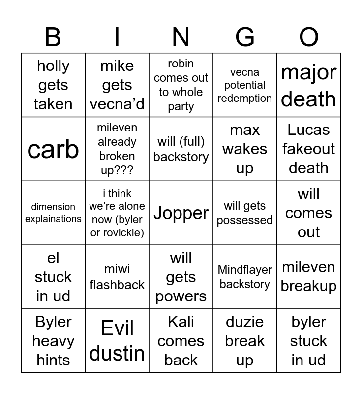 This bingo card has a free space and 24 words: miwi flashback, Evil dustin, will (full) backstory, Byler heavy hints, major death, holly gets taken, carb, mike gets vecna’d, will gets possessed, will gets powers, max wakes up, dimension explainations, Mindflayer backstory, mileven breakup, mileven already broken up???, duzie break up, will comes out, robin comes out to whole party, Lucas fakeout death, i think we’re alone now (byler or rovickie), byler stuck in ud, el stuck in ud, vecna potential redemption and Kali comes back.