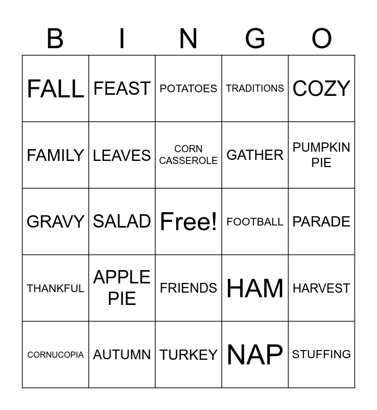 This bingo card has a free space and 24 words: APPLE PIE, AUTUMN, CORN CASSEROLE, CORNUCOPIA, COZY, FALL, FAMILY, FEAST, FOOTBALL, FRIENDS, GATHER, GRAVY, HAM, HARVEST, LEAVES, NAP, PARADE, POTATOES, PUMPKIN PIE, SALAD, STUFFING, THANKFUL, TRADITIONS and TURKEY.