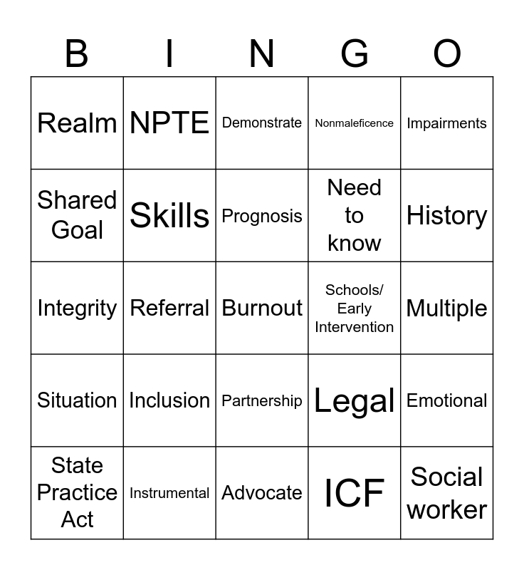 This bingo card has 209 words: APTA, Chapter, Sections, CSM, Movement, Home Health, Acute Care, Private Practice, CAPTE, NPTE, FSBPT, Code of Ethics, Free!, Discriminate, Trustworthy, Lifelong, Business, Core Values, Accountability, Altruism, Collaboration, Compassion & Caring, Duty, Excellence, Inclusion, Integrity, Social Responsibility, Mission, Schools/ Early Intervention, Vision, Sports Performance, Learning, Cognitive, Psychomotor, Affective, Exposure, Trust, Person-first, Acquisition, Integration, Process, Written, Nonverbal, Private, Specific, Open ended, Affirmations, Reflections, Summaries, Trust, OARS, Partnership, Compassion, Burnout, Empathy, Respect, Resistance, Patient, Judgmental, Internal, Instrumental, Digital Confirmation, Adapt, Documentation, Referral, ICF, Health condition, Medical, Physical Therapy, Body Structure/function, Activity, Participation, Impairments, Limitations, Restrictions, Contextual, PCMM, Examination, History, Environmental, Subjective, Referral, Medical, PT, Evaluation, Prognosis, Plan of Care, Function, Behavior, Adult, Culture, Gender, Generational, Societal, Past experiences, Visual, Kinesthetic, Auditory, Supplemental, Comprehension, Literacy, Words, Teach back, Show me, Demonstrate, 8th, Style, Multiple, Plain, End, Maintained, Behavior, Younger, In-charge, Leader, Manager, Barriers, Opportunities, Toolbox, Knowledge, Skills, Behaviors, Becomes, Emotional, Personal Competence, Social Competence, Tough, Role, Policy, APTA, Equity, Inclusion, Legislative, PTPAC, Social Determinants, Manage, Co-manage, Consultant, Referral, Direct access, Duplication, Missed, Conflict, Roles, Pharmacist, Social worker, Case manager, SLP, Respiratory therapist, Nurse, Rounds, Shadowing, Shared Goal, Biased, Occupational therapists, Radiology, Curious, Breaking down silos, Shared Responsibility, Statute, Regulations, State Practice Act, APTA, WCPT, PT-PAC, ABPTS, Policy, Licensure, Scope of Practice, Jurisprudence Exam, NPTE, CAPTE, State Board of PT, Delegation, Disciplinary Actions, Informed consent, Reasonable alternatives, Comprehension, Re-explain, Risks and benefits, Patient information, PHI, Need to know, Process, Sensitivity, Abdicated, Judgement, Define, Chosen action, Conflict, Dilemma, Temptation, Distress, Advocate, Realm, Situation, Silence, Courage, Beneficence, Integrity, Nonmaleficence, Autonomy, Confidentiality, Motivation, Personal, Solution, More than one, Legal and Ethical.