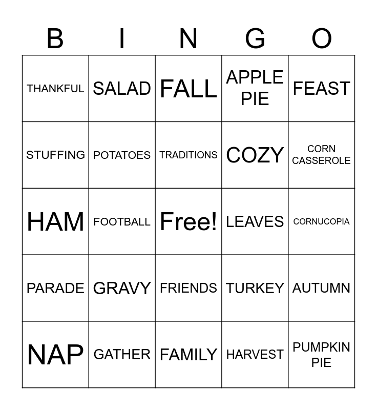This bingo card has a free space and 24 words: GRAVY, GATHER, TRADITIONS, NAP, FEAST, THANKFUL, STUFFING, SALAD, LEAVES, FRIENDS, COZY, HAM, TURKEY, AUTUMN, POTATOES, HARVEST, CORNUCOPIA, FALL, CORN CASSEROLE, FOOTBALL, PUMPKIN PIE, PARADE, APPLE PIE and FAMILY.