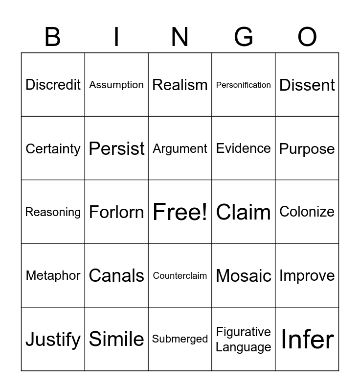 This bingo card has a free space and 25 words: Canals, Submerged, Argument, Justify, Dissent, Discredit, Certainty, Assumption, Claim, Counterclaim, Evidence, Reasoning, Mosaic, Improve, Persist, Persuade, Colonize, Realism, Purpose, Forlorn, Infer, Simile, Metaphor, Personification and Figurative Language.
