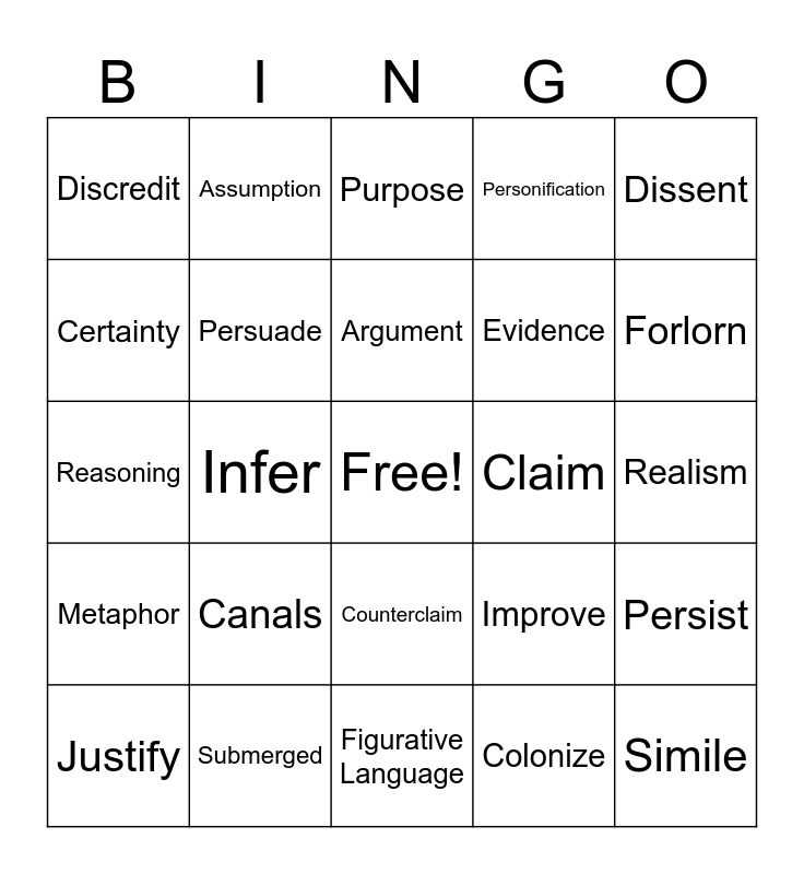 This bingo card has a free space and 24 words: Canals, Submerged, Argument, Justify, Dissent, Discredit, Certainty, Assumption, Claim, Counterclaim, Evidence, Reasoning, Improve, Persist, Persuade, Colonize, Realism, Purpose, Forlorn, Infer, Simile, Metaphor, Personification and Figurative Language.