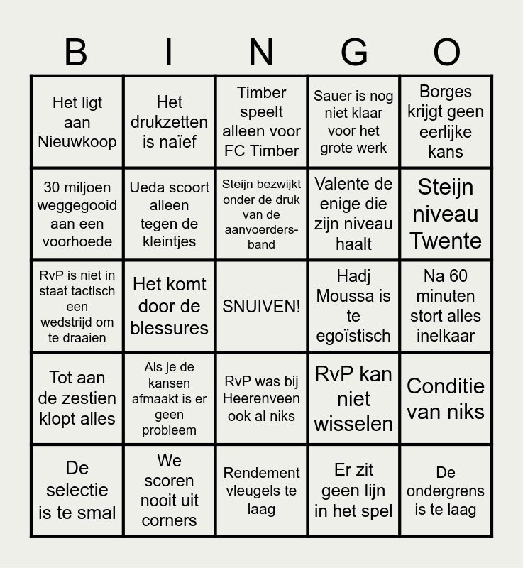 This bingo card has a free space and 24 words: Als je de kansen afmaakt is er geen probleem, We scoren nooit uit corners, Steijn bezwijkt onder de druk van de aanvoerders- band, De selectie is te smal, Borges krijgt geen eerlijke kans, Het ligt aan Nieuwkoop, 30 miljoen weggegooid aan een voorhoede, Het drukzetten is naïef, Hadj Moussa is te egoïstisch, RvP was bij Heerenveen ook al niks, Valente de enige die zijn niveau haalt, RvP is niet in staat tactisch een wedstrijd om te draaien, RvP kan niet wisselen, Conditie van niks, Ueda scoort alleen tegen de kleintjes, Er zit geen lijn in het spel, Na 60 minuten stort alles inelkaar, Timber speelt alleen voor FC Timber, Steijn niveau Twente, Het komt door de blessures, De ondergrens is te laag, Tot aan de zestien klopt alles, Sauer is nog niet klaar voor het grote werk and Rendement vleugels te laag.