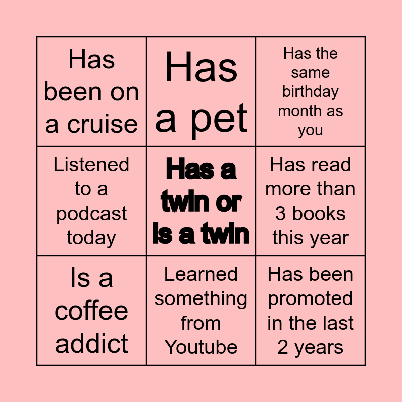 This bingo card has a free space and 8 words: Has read more than 3 books this year, Has the same birthday month as you, Has a pet, Is a coffee addict, Has been on a cruise, Has been promoted in the last 2 years, Listened to a podcast today and Learned something from Youtube.