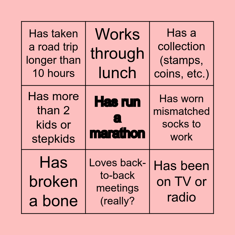 This bingo card has a free space and 8 words: Has worn mismatched socks to work, Has a collection (stamps, coins, etc.), Works through lunch, Has broken a bone, Has taken a road trip longer than 10 hours, Has been on TV or radio, Has more than 2 kids or stepkids and Loves back-to-back meetings (really?.