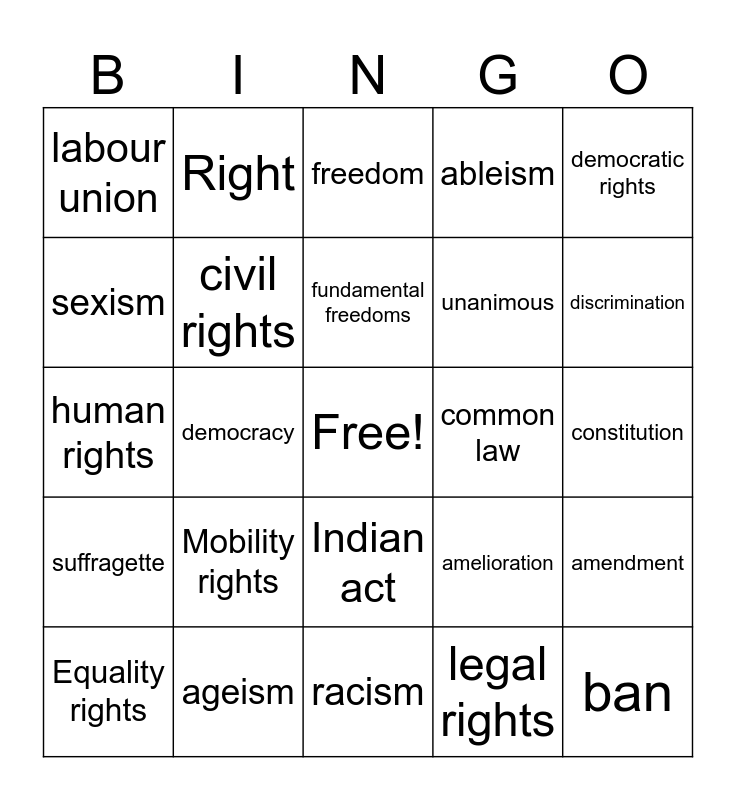 This bingo card has a free space and 24 words: Equality rights, Mobility rights, fundamental freedoms, legal rights, democratic rights, labour union, Right, freedom, common law, constitution, human rights, civil rights, amelioration, amendment, sexism, ageism, racism, ableism, discrimination, suffragette, democracy, Indian act, unanimous and ban.