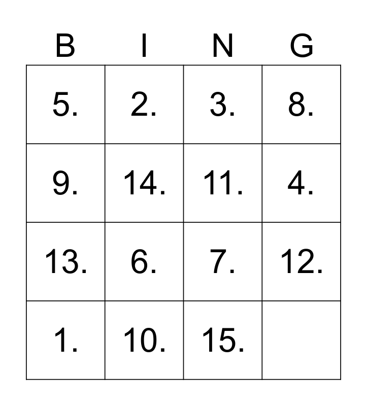 This bingo card has 16 words: Free!, 1., 2., 3., 4., 5., 6., 7., 8., 9., 10., 11., 12., 13., 14. and 15..