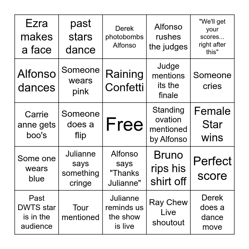 This bingo card has a free space and 26 words: Alfonso says "Thanks Julianne", Ray Chew Live shoutout, Raining Confetti, Tour mentioned, "We'll get your scores... right after this", Ezra makes a face, Alfonso dances, past stars dance, Female Star wins, Bruno rips his shirt off, Judge mentions its the finale, Carrie anne gets boo's, Perfect score, Past DWTS star is in the audience, Someone does a flip, Bruno + Derek grab each other, Alfonso rushes the judges, Some one wears blue, Derek photobombs Alfonso, Derek does a dance move, Someone cries, Julianne reminds us the show is live, Standing ovation mentioned by Alfonso, Julianne says something cringe, Someone wears pink and Male star wins.