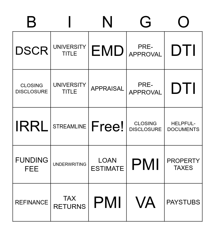 This bingo card has a free space and 106 words: LTV, UNDERWRITING, DTI, PRE-APPROVAL, IRRL, STREAMLINE, PMI, VA, FHA, CONVENTIONAL, HOI, ARM, PAYOFF, FUNDING, APPRAISAL, TITLE, EMD, SELLERS CONCESSIONS, SOCIAL SECURITY, FUNDING FEE, LOAN ESTIMATE, CLOSING DISCLOSURE, BANK STATEMENT, DSCR, LTV, UNDERWRITING, DTI, PRE-APPROVAL, IRRL, STREAMLINE, PMI, VA, FHA, CONVENTIONAL, HOI, ARM, PAYOFF, FUNDING, APPRAISAL, TITLE, EMD, SELLERS CONCESSIONS, SOCIAL SECURITY, FUNDING FEE, LOAN ESTIMATE, CLOSING DISCLOSURE, BANK STATEMENT, DSCR, CTC, PAYSTUBS, W-2'S, TAX RETURNS, ESCROW, USDA, PROPERTY TAXES, UWM, CREDCO, 47%, HELPFUL-DOCUMENTS, UNIVERSITY TITLE, FIRST TITLE, APR, PITI, REFINANCE, JUMBO, LTV, UNDERWRITING, DTI, PRE-APPROVAL, IRRL, STREAMLINE, PMI, VA, FHA, CONVENTIONAL, HOI, ARM, PAYOFF, FUNDING, APPRAISAL, TITLE, EMD, SELLERS CONCESSIONS, SOCIAL SECURITY, FUNDING FEE, LOAN ESTIMATE, CLOSING DISCLOSURE, BANK STATEMENT, DSCR, CTC, PAYSTUBS, W2'S, TAX RETURNS, ESCROW, USDA, PROPERTY TAXES, UWM, CREDCO, 47%, HELPFUL-DOCUMENTS, UNIVERSITY TITLE, FIRST TITLE, APR, PITI, REFINANCE and JUMBO.