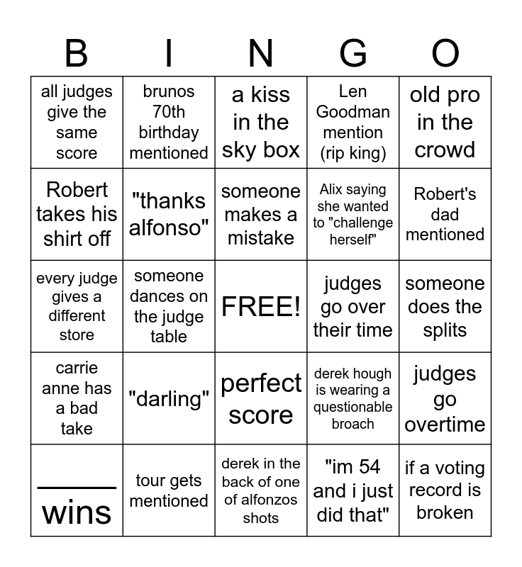 This bingo card has a free space and 34 words: Bruno stands up, "im 54 and i just did that", "we'll get your scores... after this", a pro exaggerates their counting, carrie anne has a bad take, "thanks alfonso", old pro in the crowd, ____ wins, brunos 70th birthday mentioned, a judge cries, someone makes a mistake, a kiss in the sky box, judge demos a move, julianne says something awkward, judges go over their time, Robert's dad mentioned, tour gets mentioned, every judge gives a different store, "darling", derek hough is wearing a questionable broach, perfect score, celebrity in the crowd, all judges give the same score, someone does the splits, derek in the back of one of alfonzos shots, if a voting record is broken, Len Goodman mention (rip king), Jordan Chiles does a flip, Alix saying she wanted to "challenge herself", Robert takes his shirt off, Carrie ann goes on the dance floor, someone dances on the judge table, judges go overtime and Zac Efron is in the crowd.