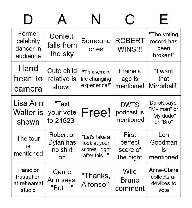 This bingo card has a free space and 34 words: Perfect Score, Wild Bruno comment, "I can't believe I made it to the finale!", "I couldn't have done this without my pro...", The tour is mentioned, Cute child relative is shown, "The voting record has been broken!", Panic or frustration at rehearsal studio, Confetti falls from the sky, "That was the best dance of the night!", "This was a life changing experience!", Someone cries, "I don't want this to be over!", Carrie Ann gets booed, DWTS podcast is mentioned, "I want that Mirrorball!", Carrie Ann says, "But....", Lisa Ann Walter is shown, Robert or Dylan has no shirt on, First perfect score of the night, "Let's take a look at your scores...right after this...", Past or present injury is mentioned, Former celebrity dancer in audience, Derek says, "My man" or "My dude" or "Bro", "Thanks, Alfonso!", Anne-Claire collects all devices to vote, ROBERT WINS!!!, ALIX WINS!!!, Elaine's age is mentioned, Hand heart to camera, A prop is used in a dance, "Text your vote to 21523", Len Goodman is mentioned and We are SHOCKED that someone is eliminated or doesn't win.