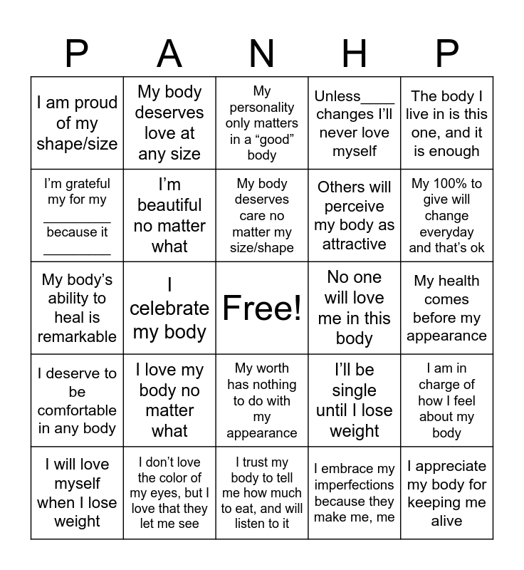 This bingo card has a free space and 24 words: I love my body no matter what, I don’t love the color of my eyes, but I love that they let me see, My body deserves care no matter my size/shape, I will love myself when I lose weight, The body I live in is this one, and it is enough, I am proud of my shape/size, I’m grateful my for my _________ because it _________, My body deserves love at any size, No one will love me in this body, My worth has nothing to do with my appearance, Others will perceive my body as attractive, My body’s ability to heal is remarkable, I’ll be single until I lose weight, I am in charge of how I feel about my body, I’m beautiful no matter what, I embrace my imperfections because they make me, me, My health comes before my appearance, My personality only matters in a “good” body, My 100% to give will change everyday and that’s ok, I celebrate my body, I appreciate my body for keeping me alive, I deserve to be comfortable in any body, Unless____ changes I’ll never love myself and I trust my body to tell me how much to eat, and will listen to it.