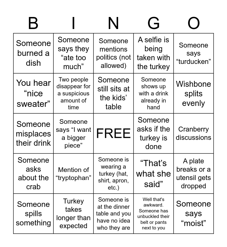 This bingo card has a free space and 24 words: Mention of “tryptophan”, Turkey takes longer than expected, Someone still sits at the kids’ table, Someone spills something, Someone says “turducken”, Someone burned a dish, You hear “nice sweater”, Someone says they “ate too much”, Someone asks if the turkey is done, Someone is wearing a turkey (hat, shirt, apron, etc.), Someone shows up with a drink already in hand, Someone misplaces their drink, “That’s what she said”, A plate breaks or a utensil gets dropped, Two people disappear for a suspicious amount of time, Well that's awkward. Someone has unbuckled their belt or pants next to you, Cranberry discussions, Someone mentions politics (not allowed), Wishbone splits evenly, Someone says “I want a bigger piece”, Someone says “moist”, Someone asks about the crab, A selfie is being taken with the turkey and Someone is at the dinner table and you have no idea who they are.