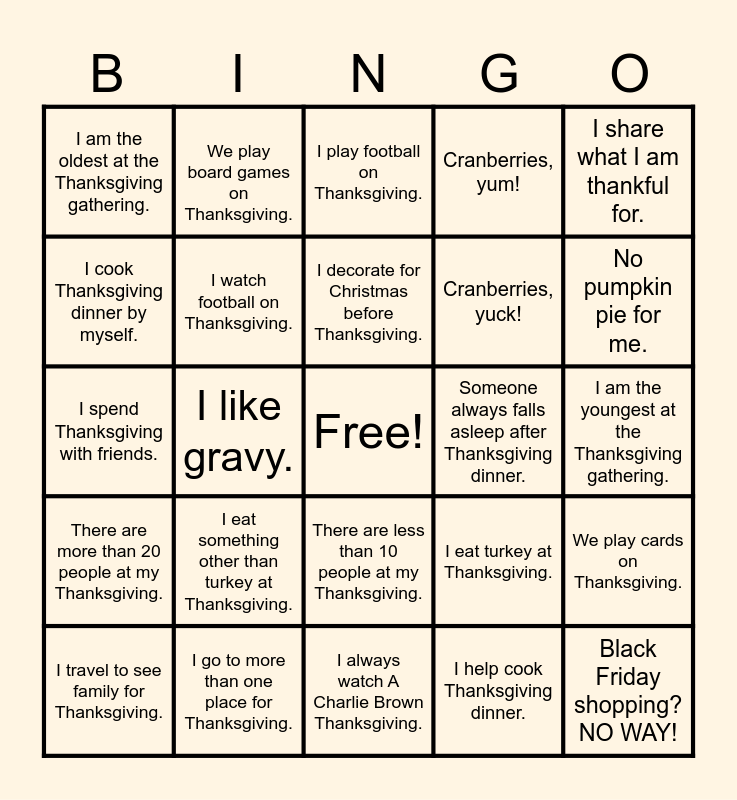 This bingo card has a free space and 33 words: I stay at home for Thanksgiving., I love pumpkin pie., I like gravy., My family decorates for Thanksgiving., There are more than 20 people at my Thanksgiving., I watch football on Thanksgiving., I share what I am thankful for., I travel to see family for Thanksgiving., We play board games on Thanksgiving., We eat macaroni and cheese at our meal., I decorate for Christmas before Thanksgiving., I play football on Thanksgiving., I'm a Black Friday shopper., I'm a cyber Monday shopper., Someone always falls asleep after Thanksgiving dinner., No pumpkin pie for me., I go to more than one place for Thanksgiving., I spend Thanksgiving with friends., I eat something other than turkey at Thanksgiving., I eat turkey at Thanksgiving., There are less than 10 people at my Thanksgiving., I wear Thanksgiving socks., I am the oldest at the Thanksgiving gathering., I am the youngest at the Thanksgiving gathering., I always watch A Charlie Brown Thanksgiving., Black Friday shopping? NO WAY!, Cranberries, yum!, Cranberries, yuck!, I cook Thanksgiving dinner by myself., We play cards on Thanksgiving., We eat out on Thanksgiving., I help cook Thanksgiving dinner. and We do a Thanksgiving potluck..