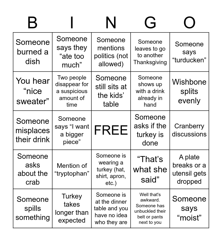 This bingo card has a free space and 24 words: Mention of “tryptophan”, Turkey takes longer than expected, Someone still sits at the kids’ table, Someone spills something, Someone says “turducken”, Someone burned a dish, You hear “nice sweater”, Someone says they “ate too much”, Someone asks if the turkey is done, Someone is wearing a turkey (hat, shirt, apron, etc.), Someone shows up with a drink already in hand, Someone misplaces their drink, “That’s what she said”, A plate breaks or a utensil gets dropped, Two people disappear for a suspicious amount of time, Well that's awkward. Someone has unbuckled their belt or pants next to you, Cranberry discussions, Someone mentions politics (not allowed), Wishbone splits evenly, Someone says “I want a bigger piece”, Someone says “moist”, Someone asks about the crab, Someone leaves to go to another Thanksgiving and Someone is at the dinner table and you have no idea who they are.