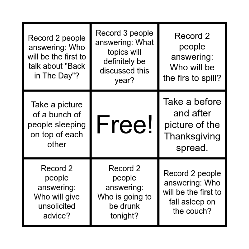 This bingo card has a free space and 15 words: Record 2 people answering: Who will be the first person to dance?, Record 2 people answering: What is a favorite TG memory?, Record 2 people answering: Who will be the firs to spill?, Record 2 people answering: Who will be the first to talk about "Back in The Day"?, Record 2 people answering: Who is going to be drunk tonight?, Record 2 people answering: Who will be the first to fall asleep on the couch?, Record 2 people answering: Can you remember any TG fails?, Record someone doing something embarrassing., Take a before and after picture of the Thanksgiving spread., Record 2 people answering: Who will give a heartfelt speech?, Record 3 people answering: How could this year's playlist be improved?, Take a picture of a bunch of people sleeping on top of each other, Record 2 people answering: Who will give unsolicited advice?, Record 3 people answering: What topics will definitely be discussed this year? and Record 2 people answering: Who will have the best calories burned to calories consumed ratio?.