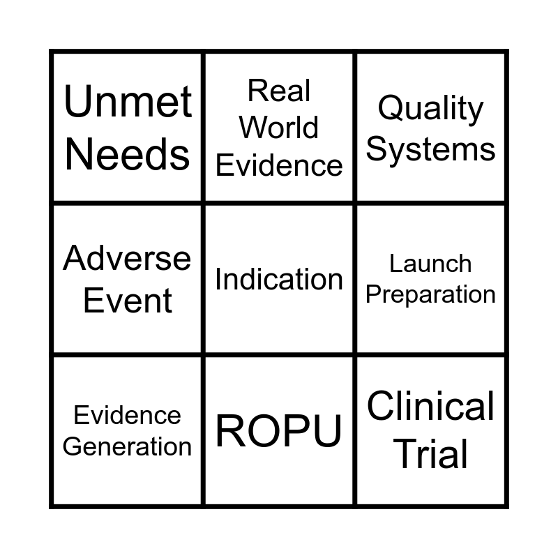 This bingo card has 19 words: Clinical Adoption, Pharmacovigilance, Quality Systems, Benefit-risk profile, Therapy Area, Indication, Compliance, Unmet Needs, Real World Evidence, Clinical Trial, Marketing Authorisation, Launch Preparation, Evidence Generation, Stakeholder Engagement, Patient-centric, Clinical Pipeline, Adverse Event, ROPU and Lifecycle management.