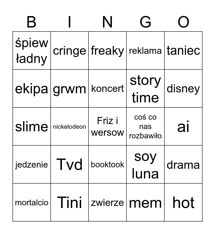 This bingo card has a free space and 24 words: Tvd, Tini, koncert, mortalcio, taniec, śpiew ładny, ekipa, cringe, coś co nas rozbawiło, booktook, story time, slime, soy luna, drama, grwm, mem, ai, freaky, disney, nickelodeon, hot, jedzenie, reklama and zwierze.