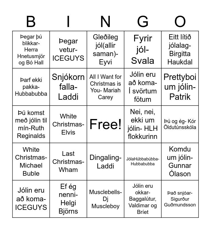 This bingo card has a free space and 41 words: Mistletoe-Justin Bieber, Þú komst með jólin til mín-Ruth Reginalds, Ég hlakka svo til-Svala, Snjókorn falla-Laddi, Ef ég nenni- Helgi Björns, Dingaling- Laddi, All I Want for Christmas is You- Mariah Carey, Someday at Christmas- Stevie Wonder, Eitt lítið jólalag- Birgitta Haukdal, White Christmas- Michael Buble, White Christmas- Elvis, Fyrir jól- Svala, Það snjóar- Sigurður Guðmundsson, Þú og ég- Kór Öldutúnsskóla, Nei, nei, ekki um jólin- HLH flokkurinn, Last Christmas- Wham, Snjókorn falla- Jón Jónsson, Þegar þú blikkar- Herra Hnetusmjör og Bó Hall, Þú og ég og jól- Svala, Gleðileg jól(allir saman)- Eyvi, Komdu um jólin- Gunnar Ólason, Jólaminning- Aron Can, Musclebells- Dj Muscleboy, Jólin eru að koma- Í svörtum fötum, Jólin(þau eru á hverju ári)- Stebbi Hilmars og Jón Jónsson, Happy XMAS- Celine Dion, Jólin eru okkar- Baggalútur, Valdimar og Bríet, Jólabróðir- Jón Jónsson og Frikki Dór, Prettyboi um jólin- Patrik, Þessi týpísku jól- ICEGUYS, Þú komst með jólin til mín- ICEGUYS, Þegar vetur- ICEGUYS, Jólin eru að koma- ICEGUYS, Skóinn út í glugga- Laddi, JólaHúbbabúbba- Hubbabubba, Þarf ekki pakka- Hubbabubba, Þú og ég og jól- Hubbabubba, Þegar jólin koma- ICEGUYS, Driving Home for Christmas- Chris Rea, Partýjól- Emmsjé Gauti og Steindi jr. and Yfir fannhvíta jörð- Pálmi Gunnarsson.