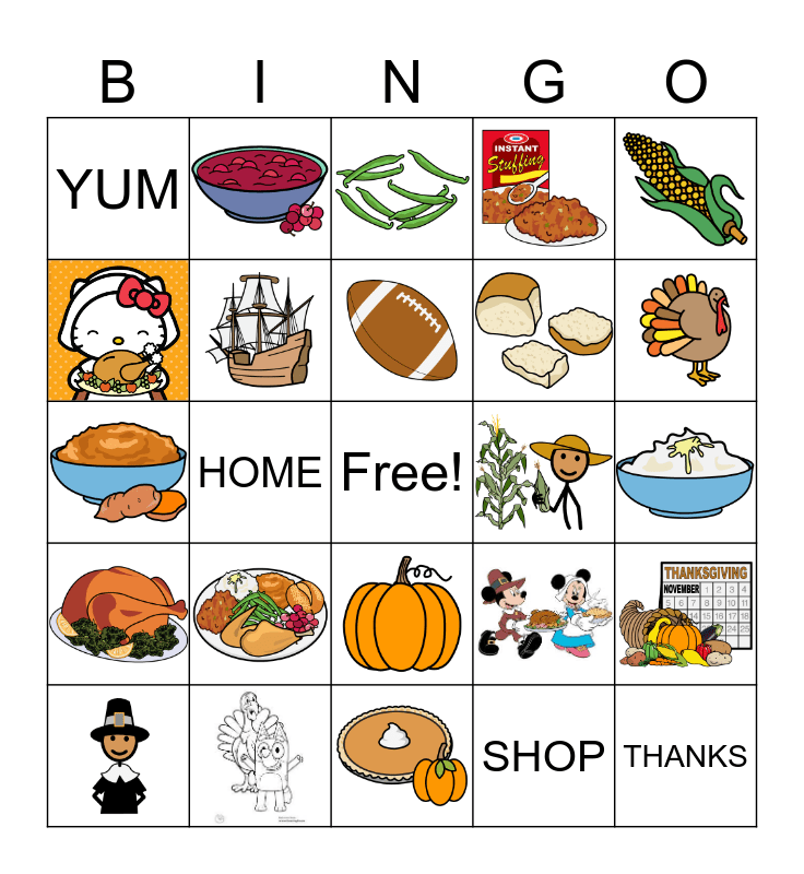 This bingo card has 20 images, a free space and 4 words: SHOP, YUM, HOME and THANKS.